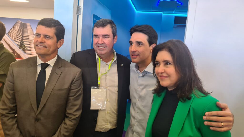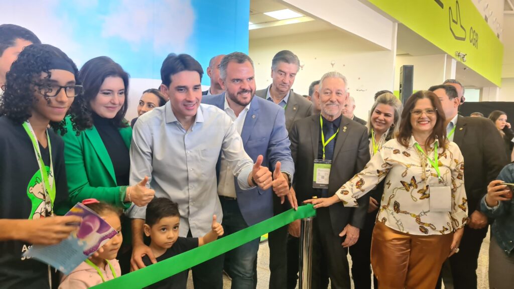 Ângelo Gabriel, Simone Tebet (Ministra do planejamento), Silvio Costa (Ministro de Portos e Aeroportos, Deputado Federal Dagoberto, Deputado Estadual Antônio Vaz e Malu Fernandes (Subsecretária de Políticas Públicas para Pessoas com Deficiência) (Foto: Geraldo Cavalcante, ASCOM Juliano Varela).